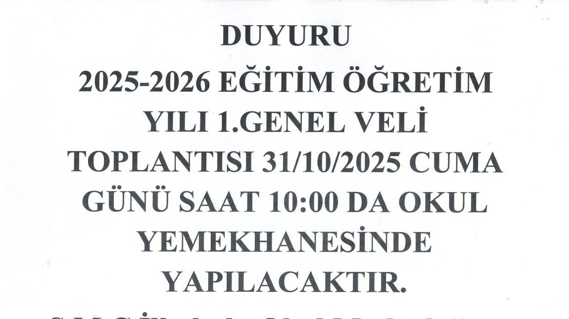 2025-2026 Eğitim Öğretim Yılı 1. Genel Veli Toplantısı 31/10/2025 Cuma Günü Saat 10.00'da Okul Yemekhanesinde Yapılacaktır.